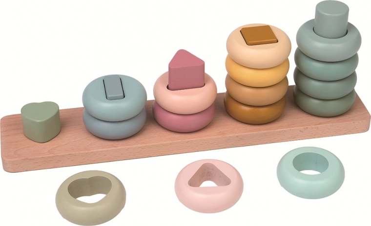 Wysokiej jakości naturalne drewno z zaokrąglonymi krawędziami i gładką powierzchnią zapewnia bezpieczną zabawę, a pastelowe i ziemiste odcienie stymulują postrzeganie kolorów bez nadmiernych bodźców. Różna liczba elementów na słupkach dodatkowo wspiera naukę liczenia i porównywanie wielkości.