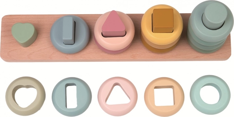 Ta sprytna układanka montessori oferuje pięć drewnianych kołków o różnych profilach – od kółka i serca po kwadrat, prostokąt i trójkąt. Dzieci stopniowo nakładają kolorowe krążki i elementy odpowiadające kształtowi kołka, a przy tym naturalnie trenują myślenie logiczne, percepcję przestrzenną i cierpliwość.
