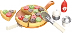 Drewniana/plastikowa pizza z segmentami i zdejmowanymi toppingami, krajalnicą oraz łopatką do serwowania rozwija kreatywność i małą motorykę.