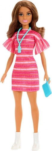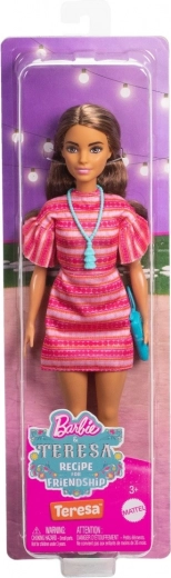 Lalka Teresa wygląda dokładnie jak w filmie BARBIE i TERESA: Przepis na przyjaźń – ma różową wzorzystą sukienkę z falbankowymi rękawami, białe buty i wyraziste turkusowe dodatki. Dzięki dopracowanym detalom stroju i makijażu jest gotowa na każdą modową przygodę.
