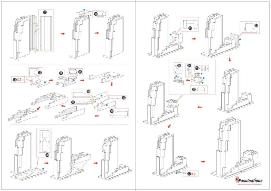 Składanie odbywa się bez kleju: elementy wyjmujesz z blaszek, łączysz je za pomocą zamków i zaczepów, a następnie doginasz małymi szczypcami, aby uzyskać solidne mocowanie. Dzięki grawerowaniu laserowemu uwydatnione są charakterystyczne detale słynnego wieżowca w Midtown Manhattanie.