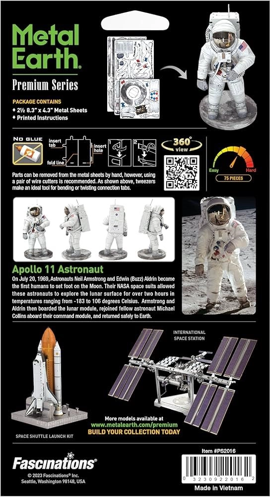 Złóż kultowego astronautę misji Apollo 11 z precyzyjnie laserowo grawerowanych stalowych arkuszy. 3D puzzle METAL EARTH oferują detaliczny metalowy model, który sprawdzi cierpliwość i zręczność oraz nagrodzi cię imponującą dekoracją o autentycznym wyglądzie.