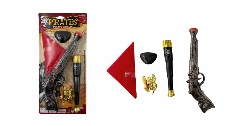 - Kompletny piracki zestaw – pistolet skałkowy, luneta, chusta, odznaka, opaska na oko.