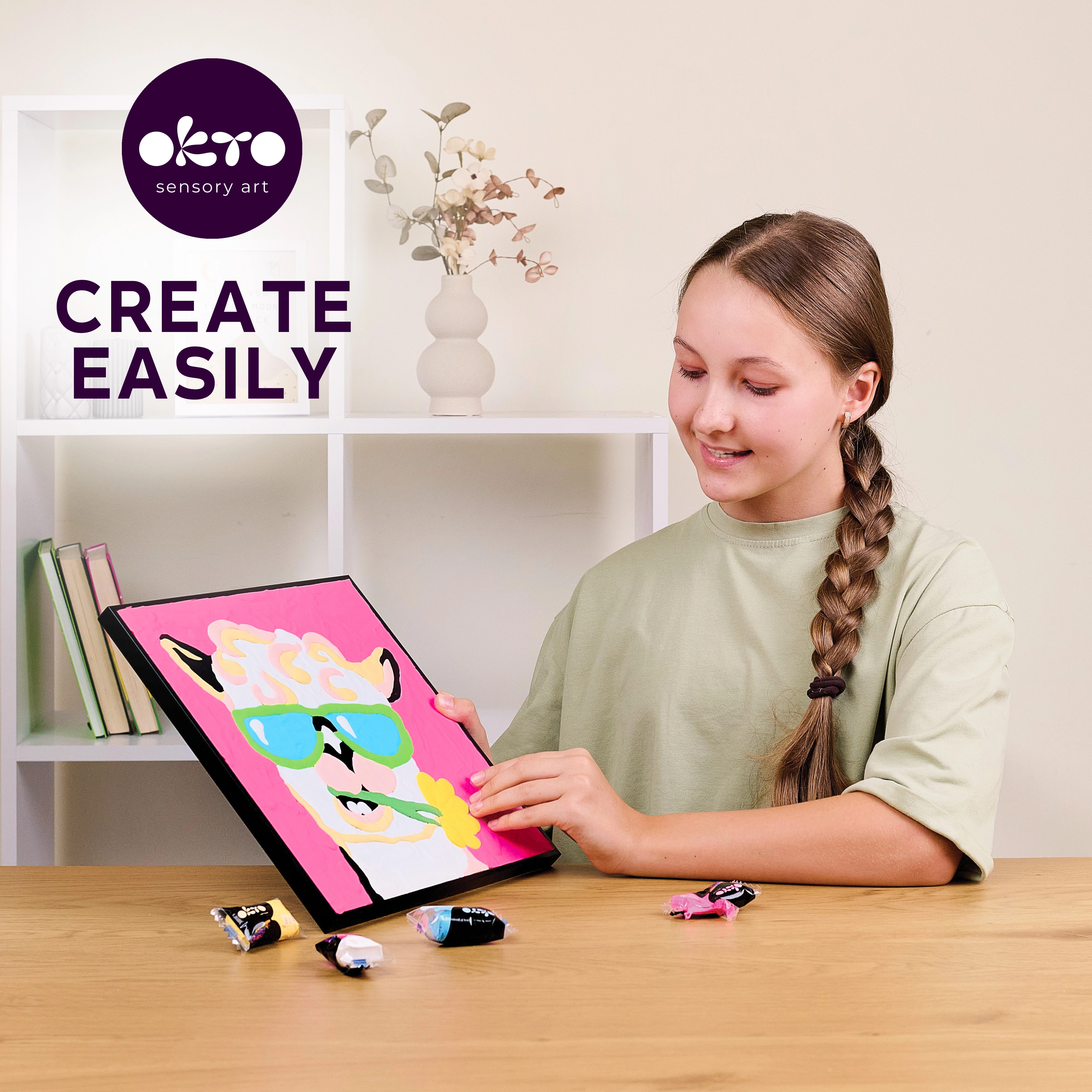 - Kompletny zestaw – w skład wchodzi płótno, obrazkowa instrukcja, narzędzie do modelowania oraz 14 szt. kolorowych mas modelujących.