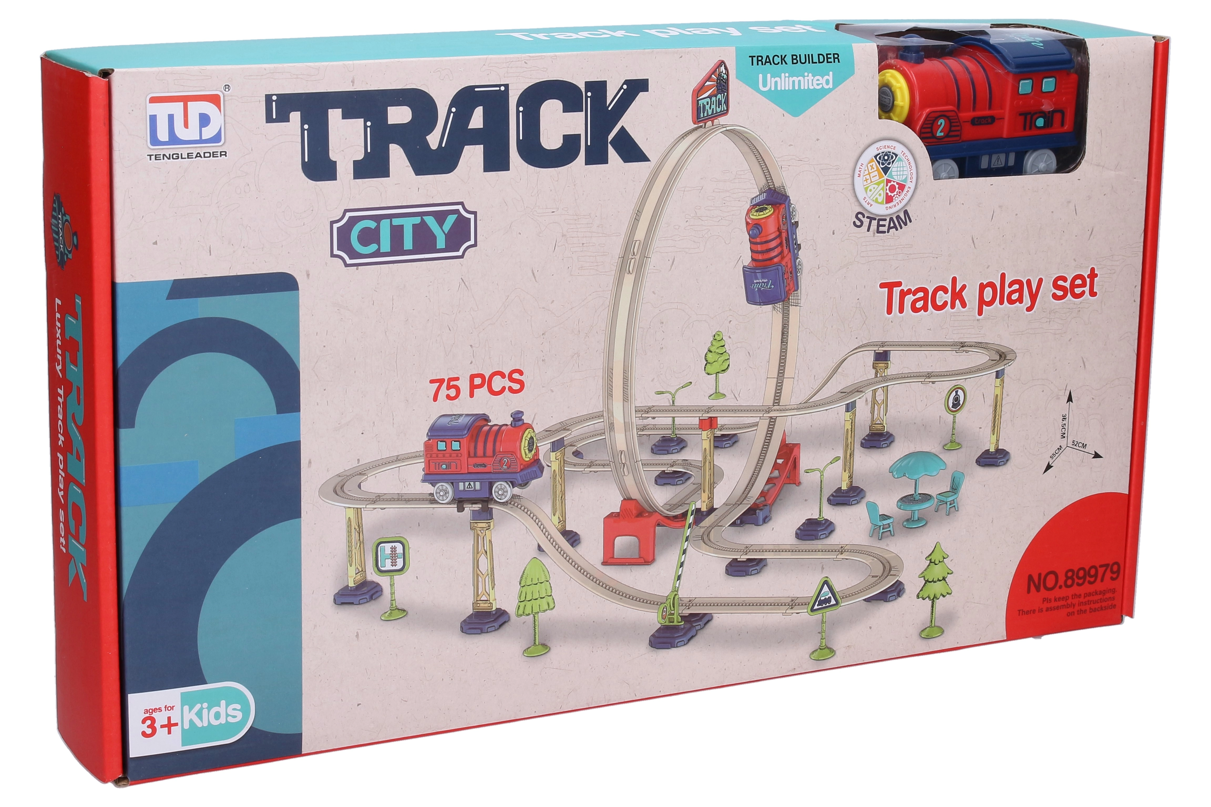 Wymiary złożonego toru to 55 × 52 × 36,5 cm, więc wygodnie zmieści się na stole lub w kąciku zabaw. Zestaw 75‑elementowy umożliwia różnorodne budowanie, a dzieci mogą przetestować ekscytujący przejazd przez pętlę. Aby uruchomić lokomotywę, wystarczy włożyć 2 × baterie AAA (brak w zestawie) i postępować zgodnie z czytelną instrukcją na opakowaniu.