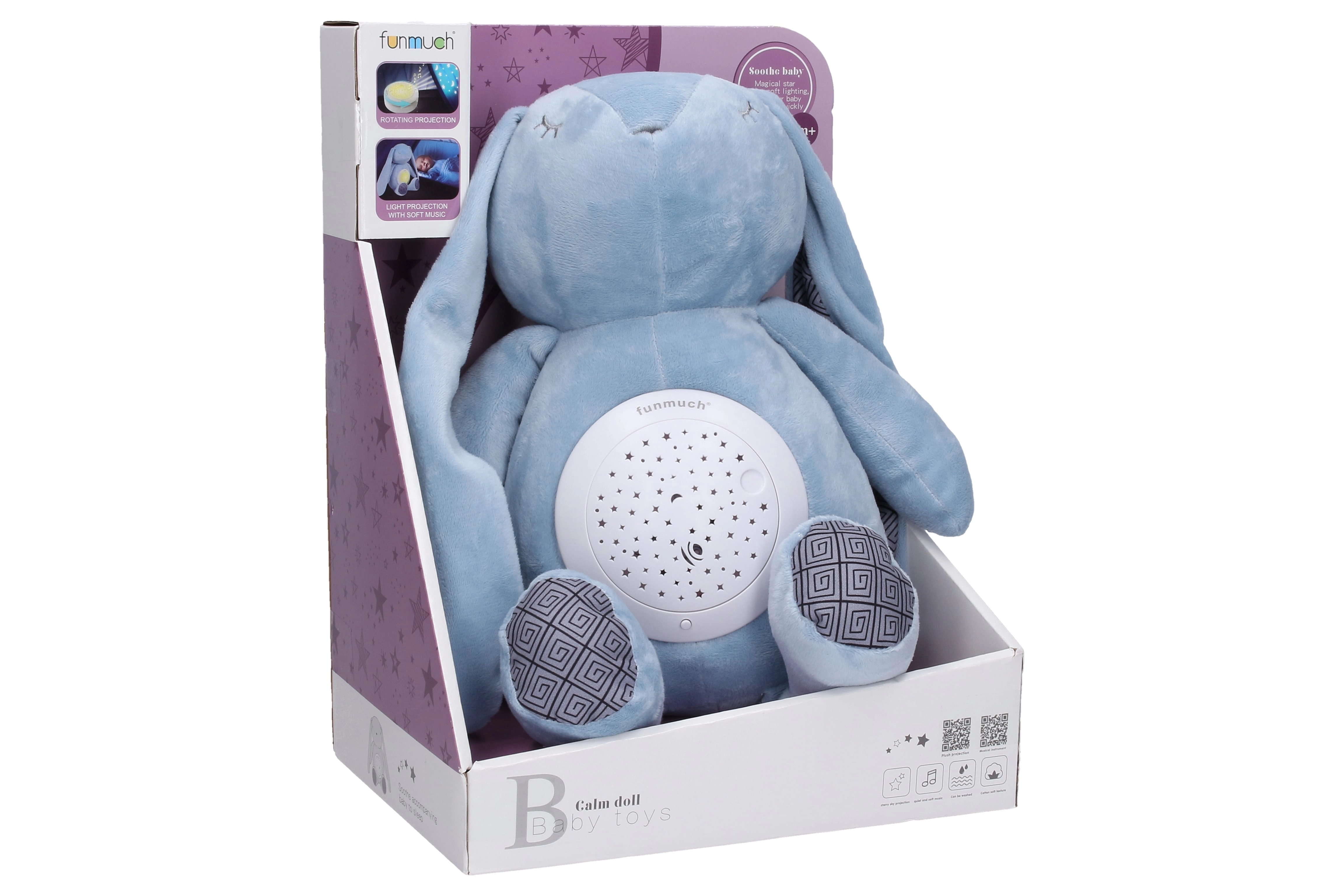 Usypiający króliczek z projekcją to idealny towarzysz do dziecięcego pokoju. Dzięki połączeniu delikatnego światła i kojących melodii tworzy przyjemną atmosferę do snu. Projektor znajduje się na brzuszku króliczka, gdzie świeci, obraca się i tworzy uspokajającą projekcję.