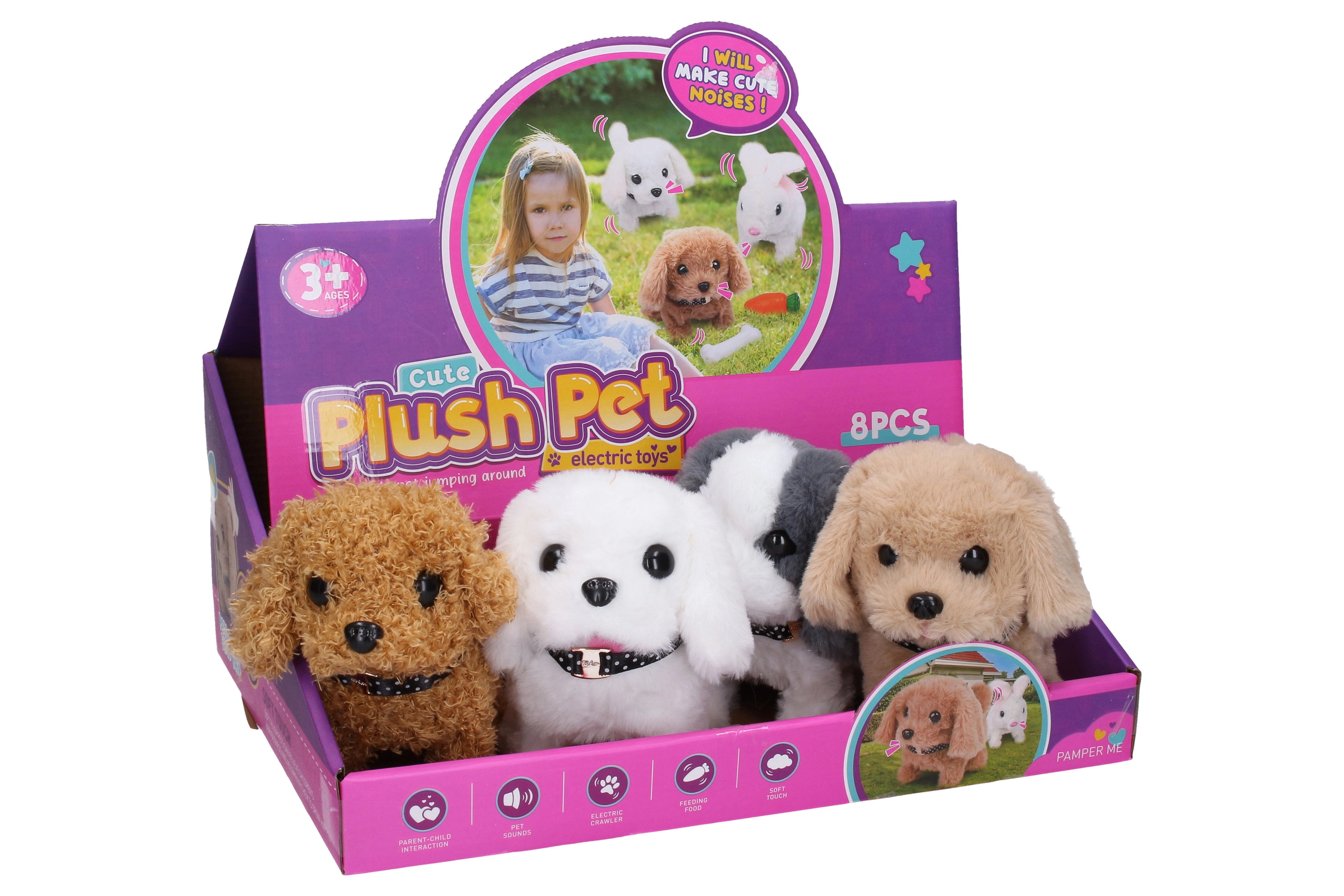 Uroczy chodzący pluszowy piesek o wielkości 16 cm dostarcza dzieciom mnóstwo zabawy. Po włączeniu chodzi, rusza ogonem i szczeka. Dostępne są 3 warianty kolorystyczne (biały, brązowy, żółty). Łatwe sterowanie dzięki przełącznikowi ON/OFF na spodzie. Zasilanie 2× AA (baterie nie wchodzą w skład zestawu).