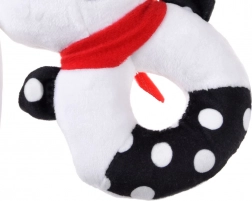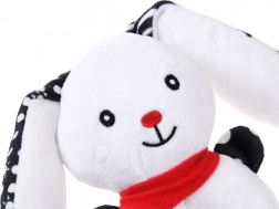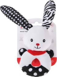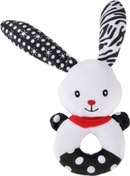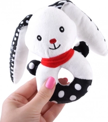 Ta miękka, kontrastowa zabawka łączy funkcje grzechotki, piszczałki i pierwszej przytulanki. Okrągły, łatwy do chwytania kształt z otworem pośrodku, wystającą główką i długimi uszami pomaga trenować małą motorykę oraz koordynację ręka–oko. Kontrastowe czarno-białe motywy są świetnie widoczne dla niemowląt i przyciągają ich uwagę.