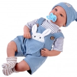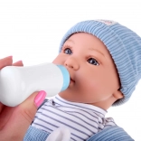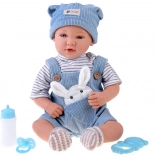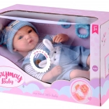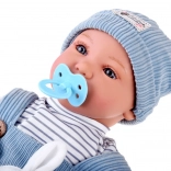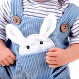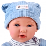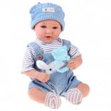 Interaktywna lalka-niemowlę zachwyca realistycznymi rysami twarzy, długimi rzęsami i wyrazistymi oczami. Ma miękkie ciałko do łatwego przytulania oraz plastikową główkę i kończyny dla trwałości podczas codziennej zabawy. Stylowy strój z niebieskiego sztruksu świetnie komponuje się z prążkowaną koszulką i dzianinową czapeczką.