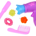 W komplecie znajdują się: grzebień, zabawkowa suszarka, prostownica, gumka oraz dwie spinki – wszystko do kreatywnych fryzur i zabawy w salon.