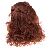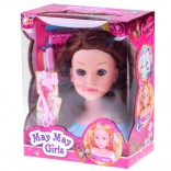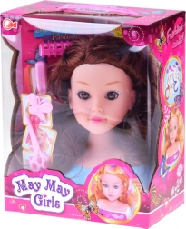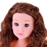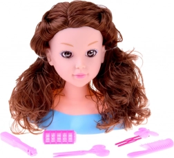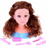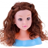 Ta głowa do stylizacji z długimi brązowymi falowanymi włosami i dopracowanym makijażem jest idealna dla małych stylistów. Pasma są miękkie i podatne, więc łatwo je czesać, kręcić i spinać. Stabilna plastikowa podstawa utrzymuje głowę na miejscu podczas stylizacji.