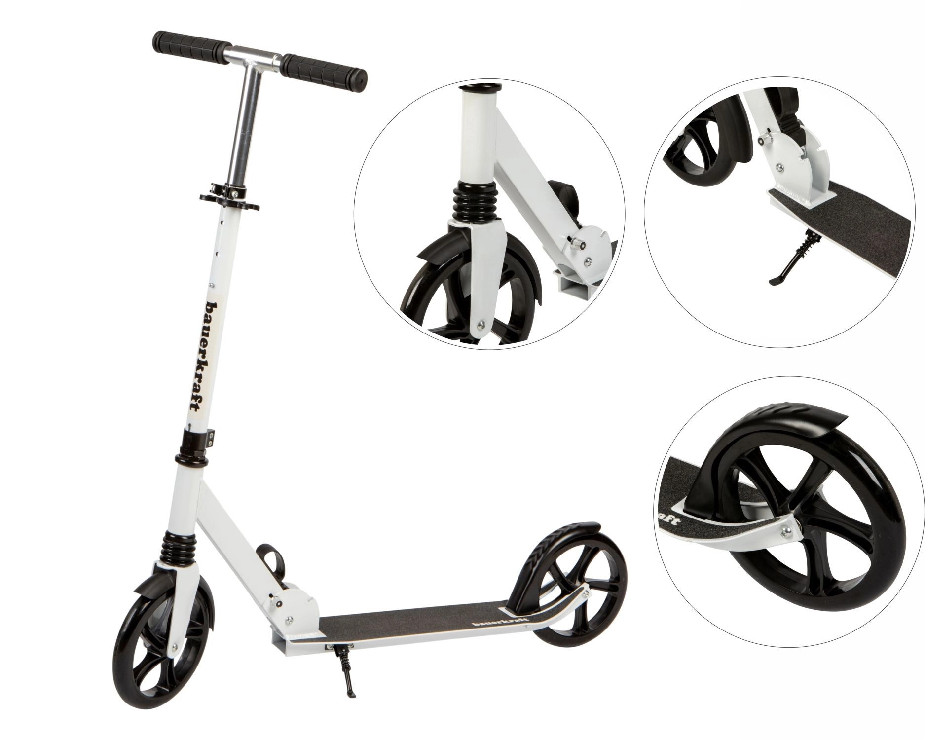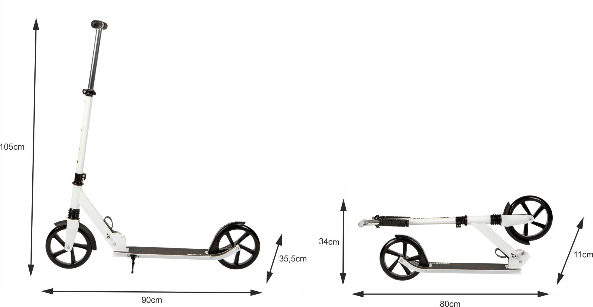 Lekka i wytrzymała miejska hulajnoga dla dzieci i nastolatków oferuje regulowaną kierownicę 95–105 cm, duże koła 200 mm z łożyskami ABEC-7, przednie amortyzowanie oraz składaną aluminiową konstrukcję. Dla bezpiecznej jazdy nie zabrakło tylnego hamulca nożnego, antypoślizgowego podestu i ergonomicznych chwytów. Maksymalne obciążenie 80 kg.