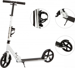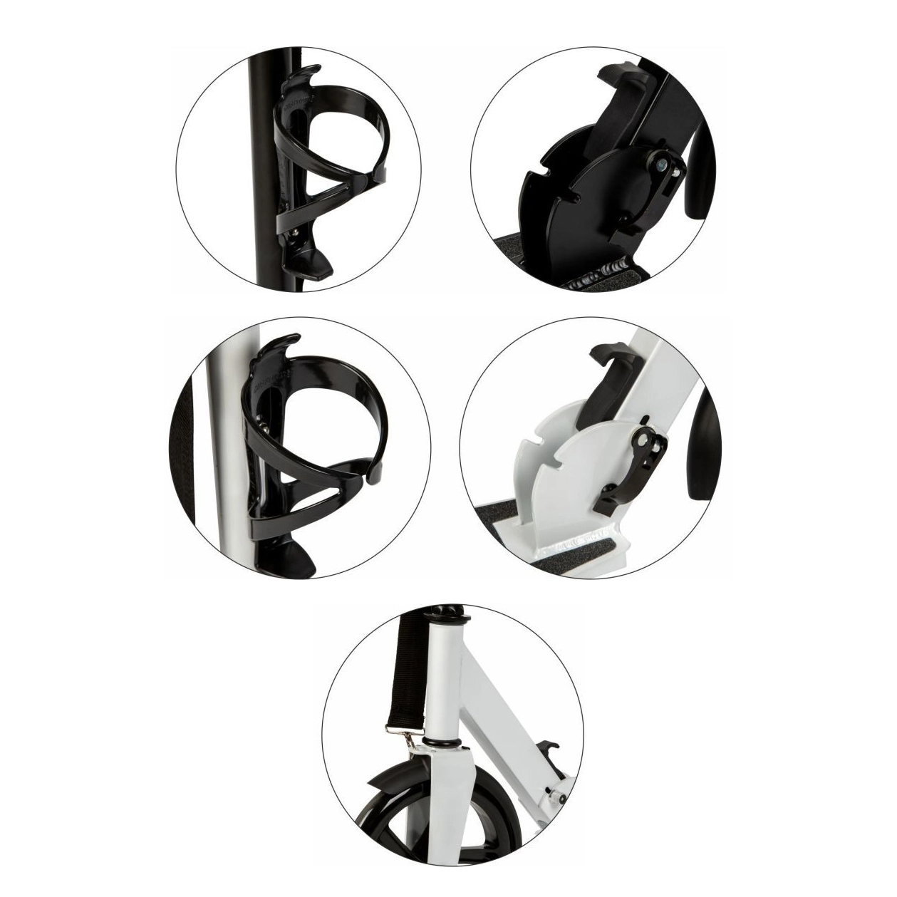 Dla maksymalnej kontroli i pewności hulajnoga ma tylny hamulec nożny, antypoślizgową powierzchnię podestu oraz ergonomiczne chwyty dla wygodnego uchwytu. Regulowana wysokość kierownicy 91–101 cm rośnie wraz z użytkownikiem i pomaga utrzymać prawidłową, ergonomiczną pozycję. Praktyczna stopka i uchwyt na bidon uzupełniają wyposażenie do codziennego użytku.