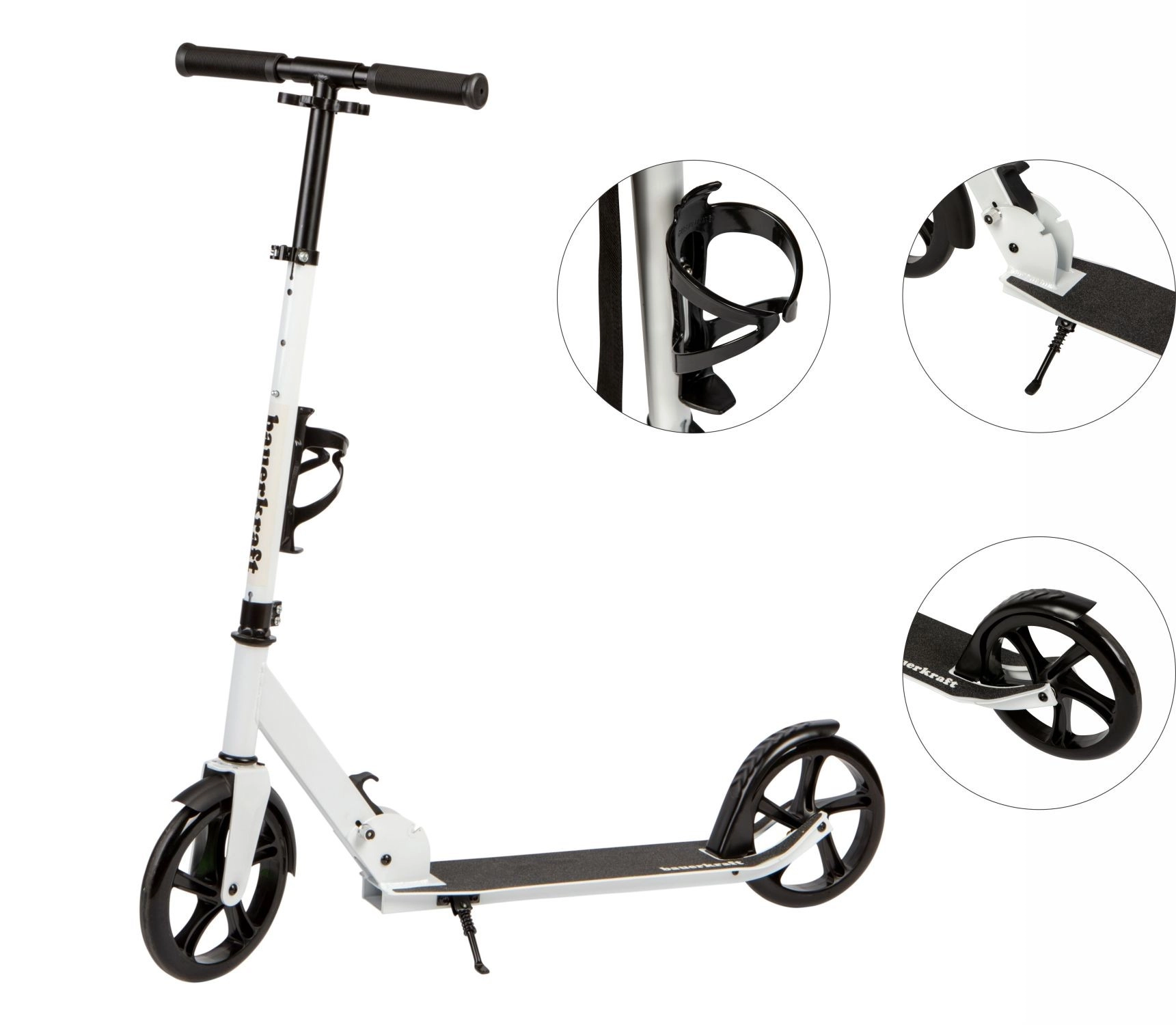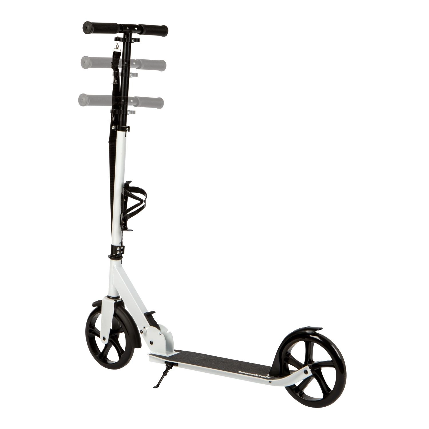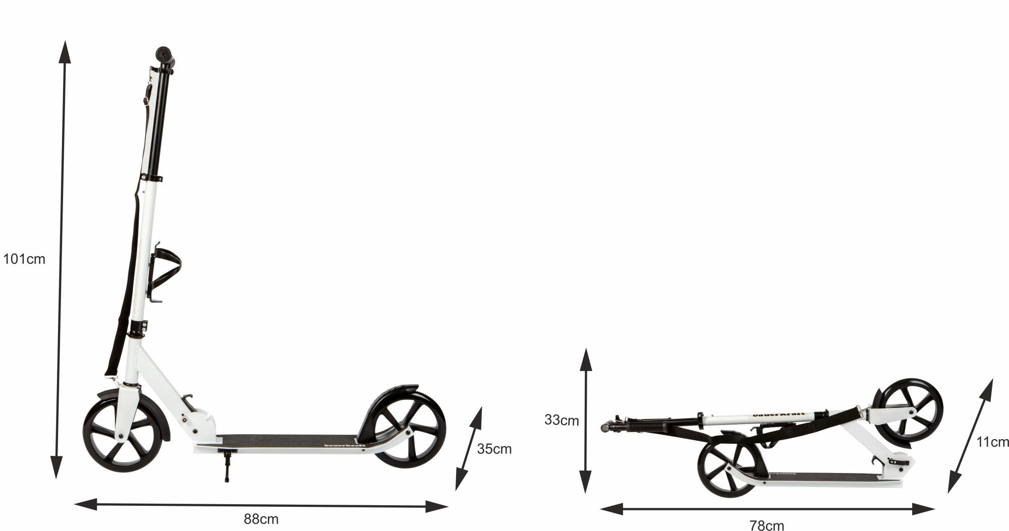 Lekka i wytrzymała konstrukcja z aluminium składa się szybko dla łatwego przenoszenia. Kierownica w zakresie 91–101 cm dopasowuje się do wzrostu dziecka i nastolatka.