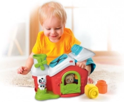 Ta interaktywna farma z linii Clemmy oferuje bezpieczną i stymulującą zabawę dla maluchów. W środku znajdziesz wiele miękkich, łatwych do chwytania klocków, które można wrzucać przez okna i przez dach. Jedna część dachu ma miękką wkładkę do sortowania, druga otwiera się dla łatwego wyjmowania klocków.
