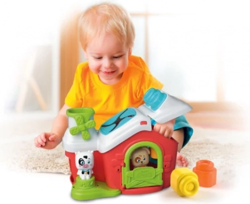 Dzieci pokochają także elementy mechaniczne: komin ma funkcję „naciśnij i wyskocz”, dzięki której klocek wysuwa się bocznym otworem, a wiatraczek zaczyna się kręcić już przy lekkim dotyku. Sensoryczne faktury na powierzchni wspierają rozwój zmysłu dotyku, a sortowanie i manipulowanie klockami rozwija koordynację ręka–oko oraz motorykę małą. Tematyczne środowisko farmy z postaciami zachęca do kreatywnej zabawy i tworzenia własnych opowieści.