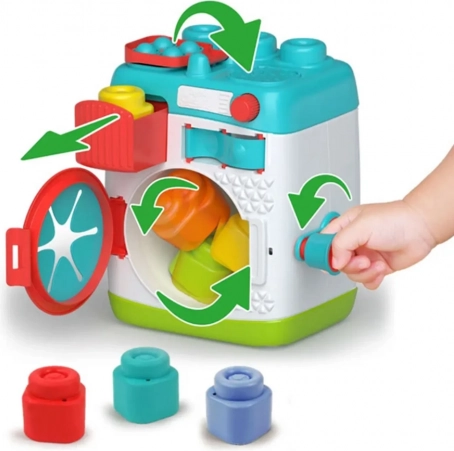 - Zabawna mechanika: obrotowe kółko „wiruje” klocki wewnątrz pralki.