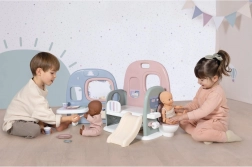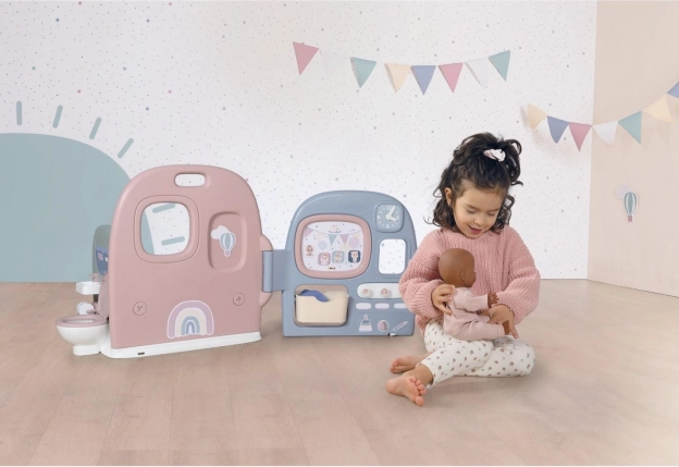 Odkryj rozbudowane centrum opieki dla lalek SMOBY BABY CARE, które dzieciom od 3 lat zapewni realistyczną zabawę w codzienną pielęgnację. Znajdziesz tu łazienkę z WC i umywalką, łóżko piętrowe ze zjeżdżalnią, kącik jadalniany i kreatywny z tabliczką oraz praktyczną skrzynię na zabawki. Dzięki składanemu mechanizmowi i uchwytowi łatwo je przenosić i przechowywać. Odpowiednie dla lalek do 42 cm i dostarczane z bogatym zestawem akcesoriów.