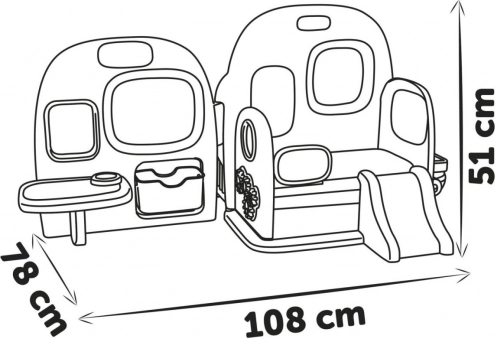W zestawie znajduje się mała łazienka z toaletą, umywalką i uchwytem na papier toaletowy, osobne łóżko piętrowe ze zjeżdżalnią na popołudniowy relaks, strefa jadalniana i twórcza z małą tablicą suchościeralną oraz skrzynia do przechowywania akcesoriów. Po zabawie całe centrum można łatwo złożyć i dzięki uchwytowi wygodnie przenieść lub schować.