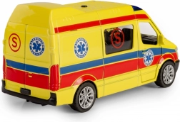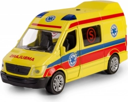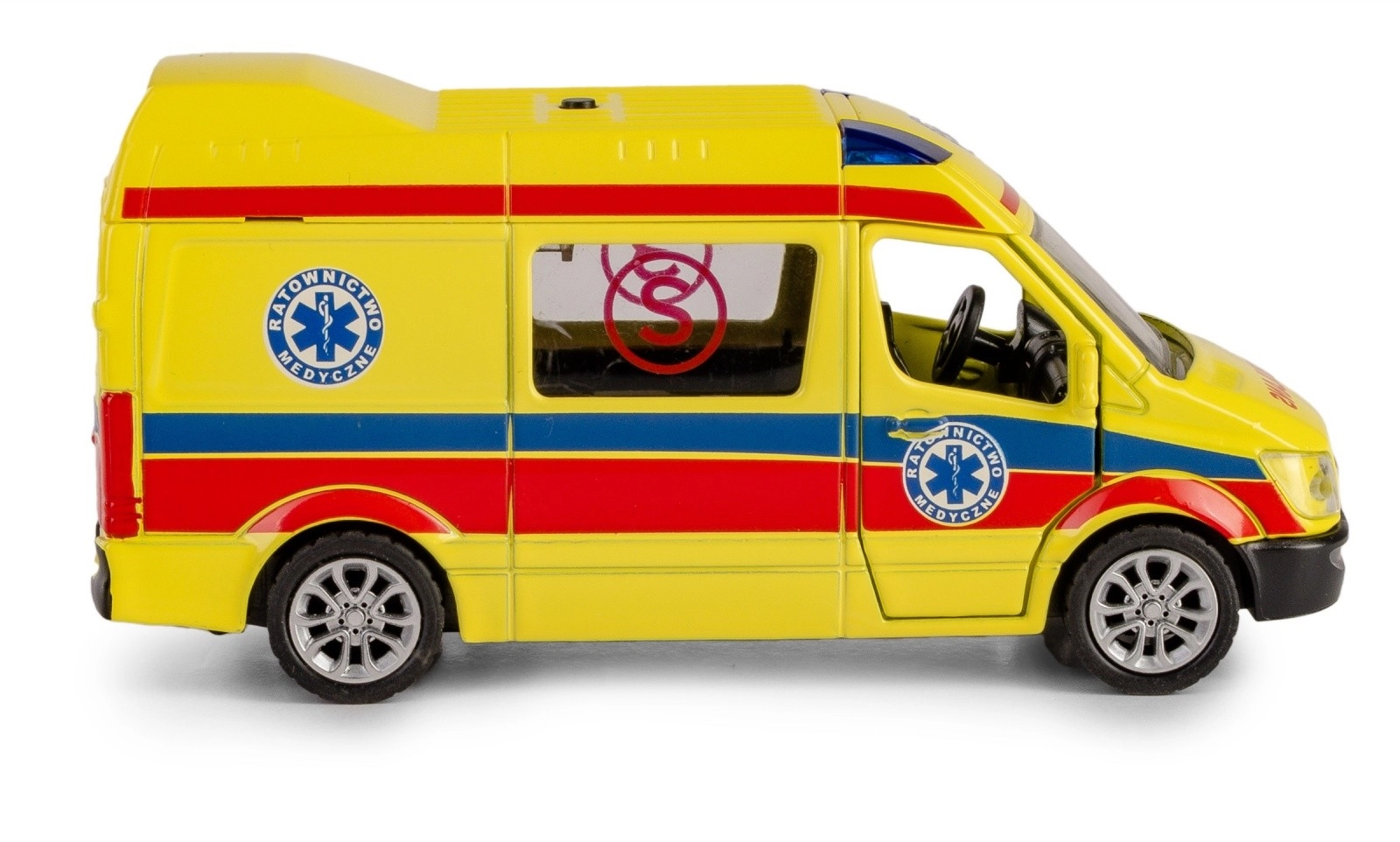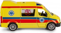 Metalowy model ambulansu typu van z elementami z tworzywa sztucznego oferuje napęd pull-back (jazda do przodu po naciągnięciu), otwierane drzwi oraz efekty świetlne i dźwiękowe. Świetny wybór dla małych fanów służb ratunkowych i kolekcjonerów.
