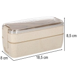 - dolny pojemnik, górny pojemnik, międzypokrywka/przegroda między poziomami, przesuwna przegroda, pokrywka z silikonową uszczelką i dwoma klipsami, 1× widelec, 1× łyżeczka
