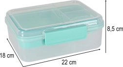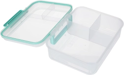 Praktyczny i pojemny lunch box o pojemności 2200 ml do pracy, szkoły i w podróży. Dzięki przemyślanemu układowi przegródek oraz osobnemu pojemniczkowi na dressing (150 ml) Twoje jedzenie pozostanie świeże, smaki się nie mieszają, a wszystko będzie bezpiecznie zamknięte dzięki silikonowej uszczelce i solidnemu klipsowi. Wykonany z materiału bez BPA, odpowiedni do zmywarki i mikrofalówki.