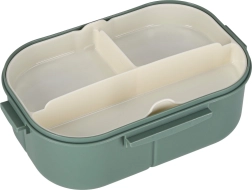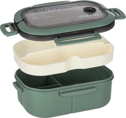 Praktyczne pudełko na lunch 1200 ml z trzema przegrodami i szczelną pokrywką z 4 klipsami utrzyma posiłek świeży i oddzielony. W zestawie wyjmowana półka, widelczyk i łyżeczka. Odpowiednie do zmywarki i mikrofalówki (bez pokrywki), wykonane z plastiku bez BPA.