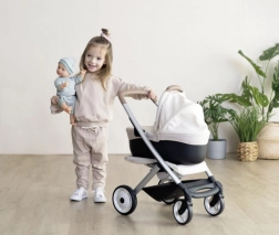 Stylowy wózek dla lalek 3 w 1 z wymienną gondolą i możliwością szybkiej zmiany na wózek spacerowy. Oferuje obrotowe przednie kółka dla łatwego manewrowania, cichą jazdę dzięki warstwie wyciszającej kół oraz ergonomiczną rączkę na wysokości 65 cm. Pokrowce z trwałej tkaniny plastikowej można łatwo przetrzeć wilgotną ściereczką. Odpowiedni dla lalek do 42 cm.