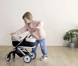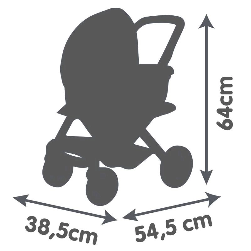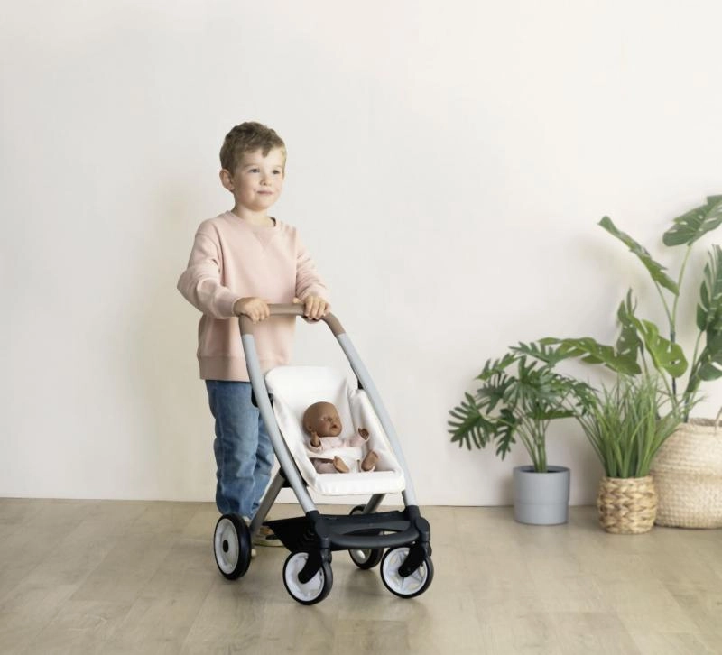 Wózek oferuje płynne prowadzenie dzięki obrotowym przednim kółkom i cichej pracy kół z warstwą wyciszającą. Trwałe pokrowce z tkaniny plastikowej łatwo utrzymać w czystości — wystarczy przetrzeć je wilgotną ściereczką. Dzięki ergonomicznej rączce (65 cm) jest wygodny dla dzieci w różnym wieku. Odpowiedni dla lalek do 42 cm.