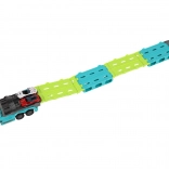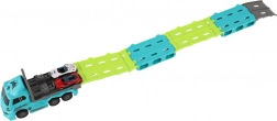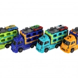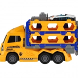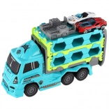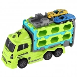 Ten wytrzymały plastikowy ciężarowy transporter służy do przewożenia małych aut wyścigowych i zapewnia dzieciom mnóstwo dynamicznej zabawy. Dzięki napędowi ciernemu po naciągnięciu sam rusza, więc idealnie nadaje się do energicznej gry na dywanie i na gładkich powierzchniach.