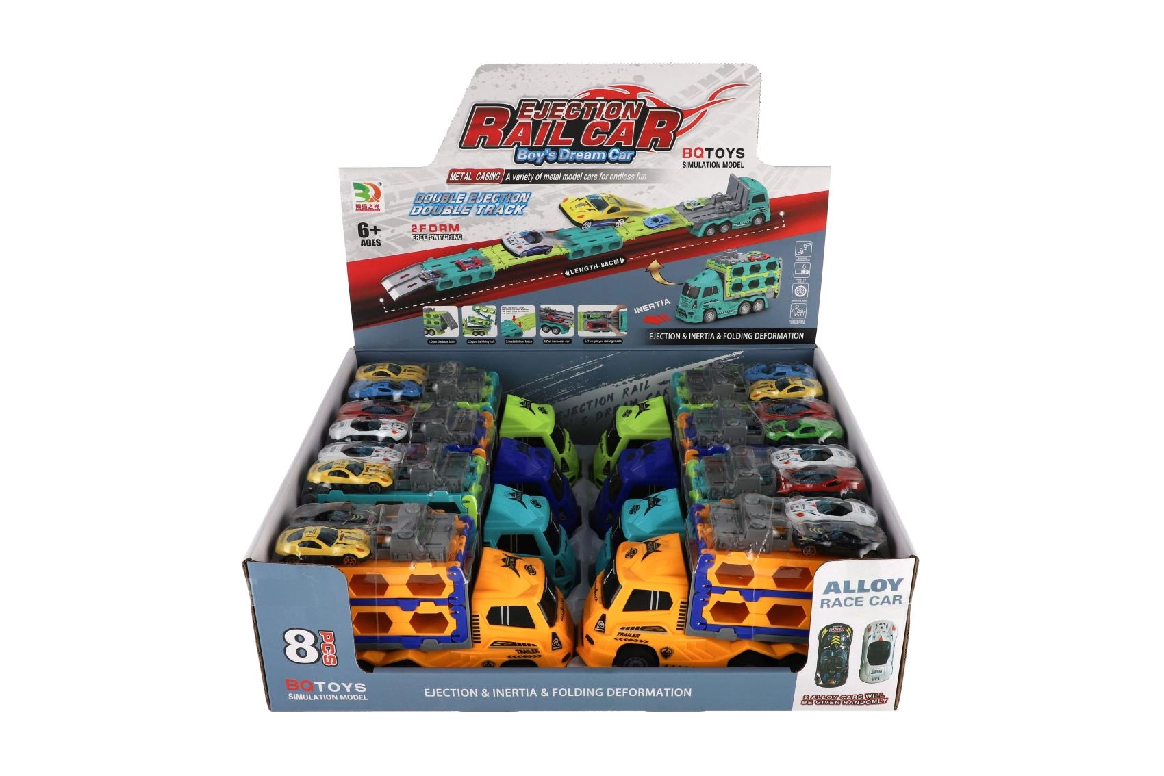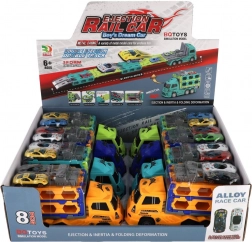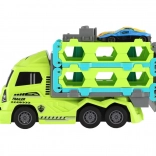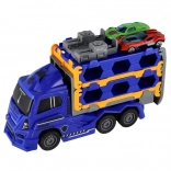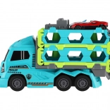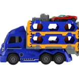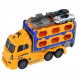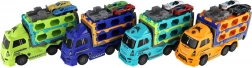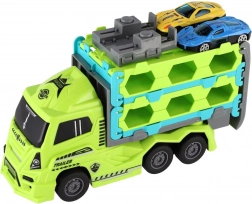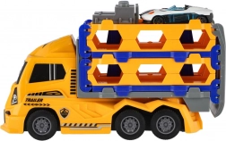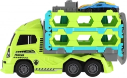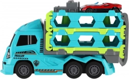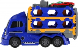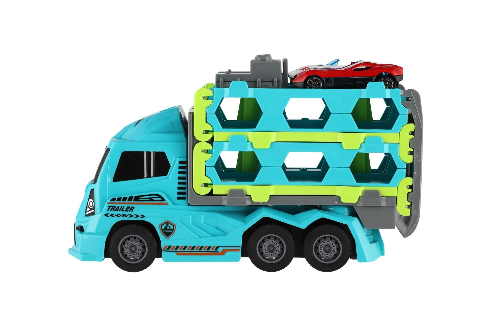 Podaruj dzieciom dynamiczną jazdę z tym plastikowym ciężarowym transporterem samochodów wyścigowych. W zestawie są 2 sportowe autka, ciężarówka ma napęd cierny dla szybkiej jazdy i długość 22 cm. Świetna do zabawy w domu i na zewnątrz, wspiera wyobraźnię i zdolności motoryczne małych kierowców.