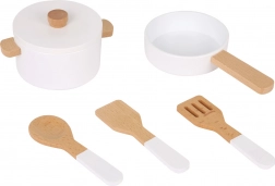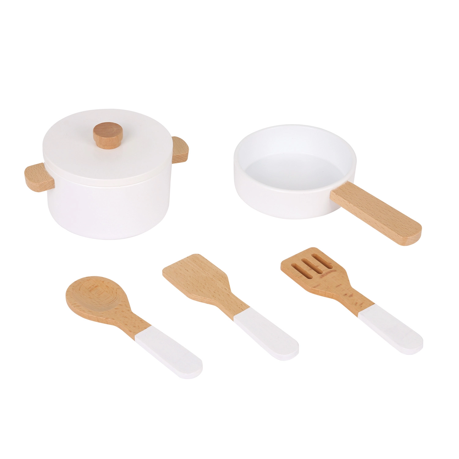 W skład zestawu wchodzi wszystko, czego potrzebują mali kucharze: złoty zlew z kranem, płyta grzewcza z obrotowymi pokrętłami, piekarnik z przezroczystymi drzwiczkami, 3 drewniane przybory kuchenne, ręcznik, solniczka, pieprzniczka oraz dwa garnki z pokrywką. Materiał wykonany ze 100% certyfikowanego drewna FSC zapewnia bezpieczną i zrównoważoną zabawę.