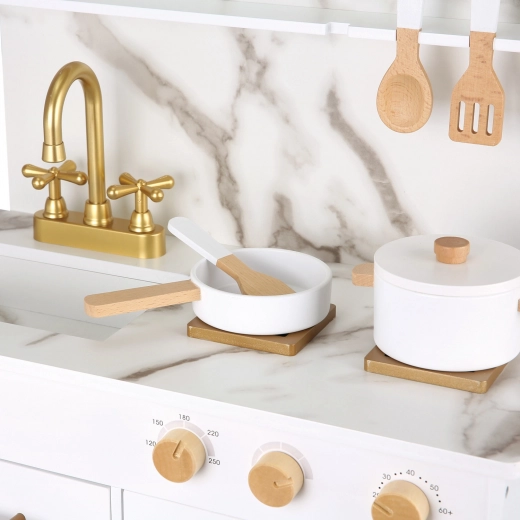 Ta nowoczesna drewniana kuchnia zapewnia dzieciom autentyczne doświadczenie gotowania w bezpiecznym i estetycznym wydaniu. Marmurkowy wygląd blatu i tła nadaje kuchni premium design, który świetnie wpasuje się zarówno do pokoju dziecięcego, jak i salonu. Dzieci mogą gotować, mieszać, piec oraz zmywać naczynia, naśladując dorosłych w domu.