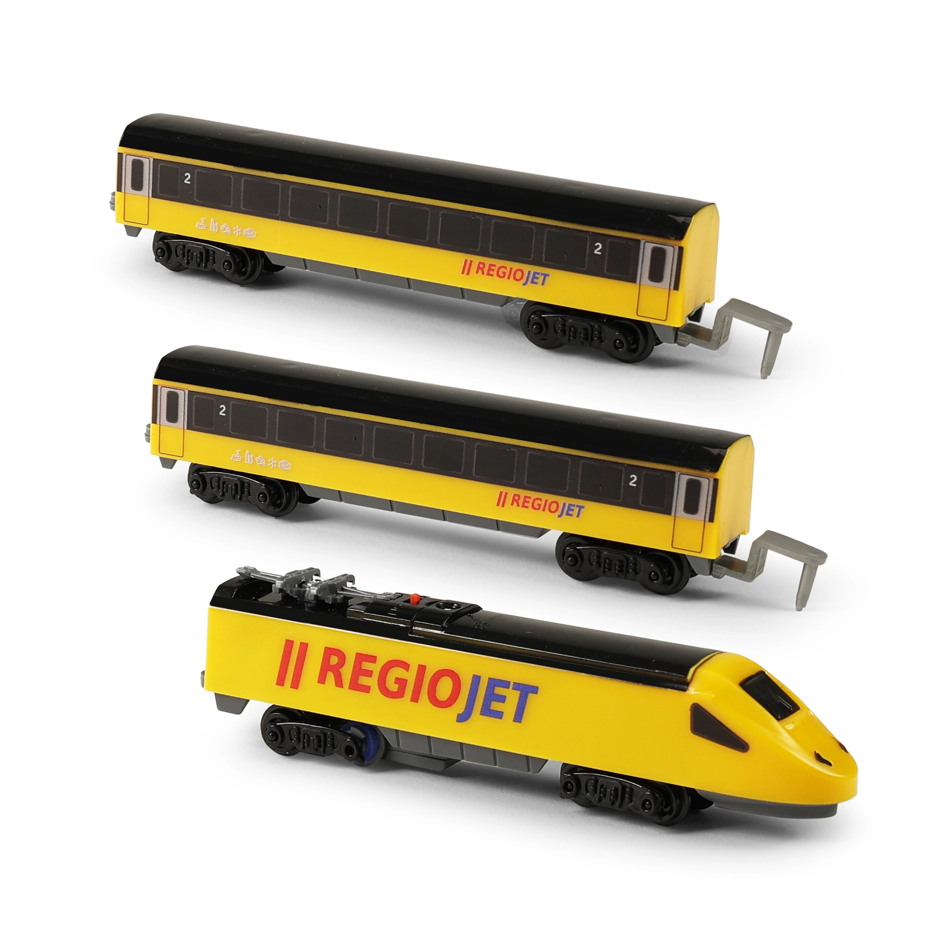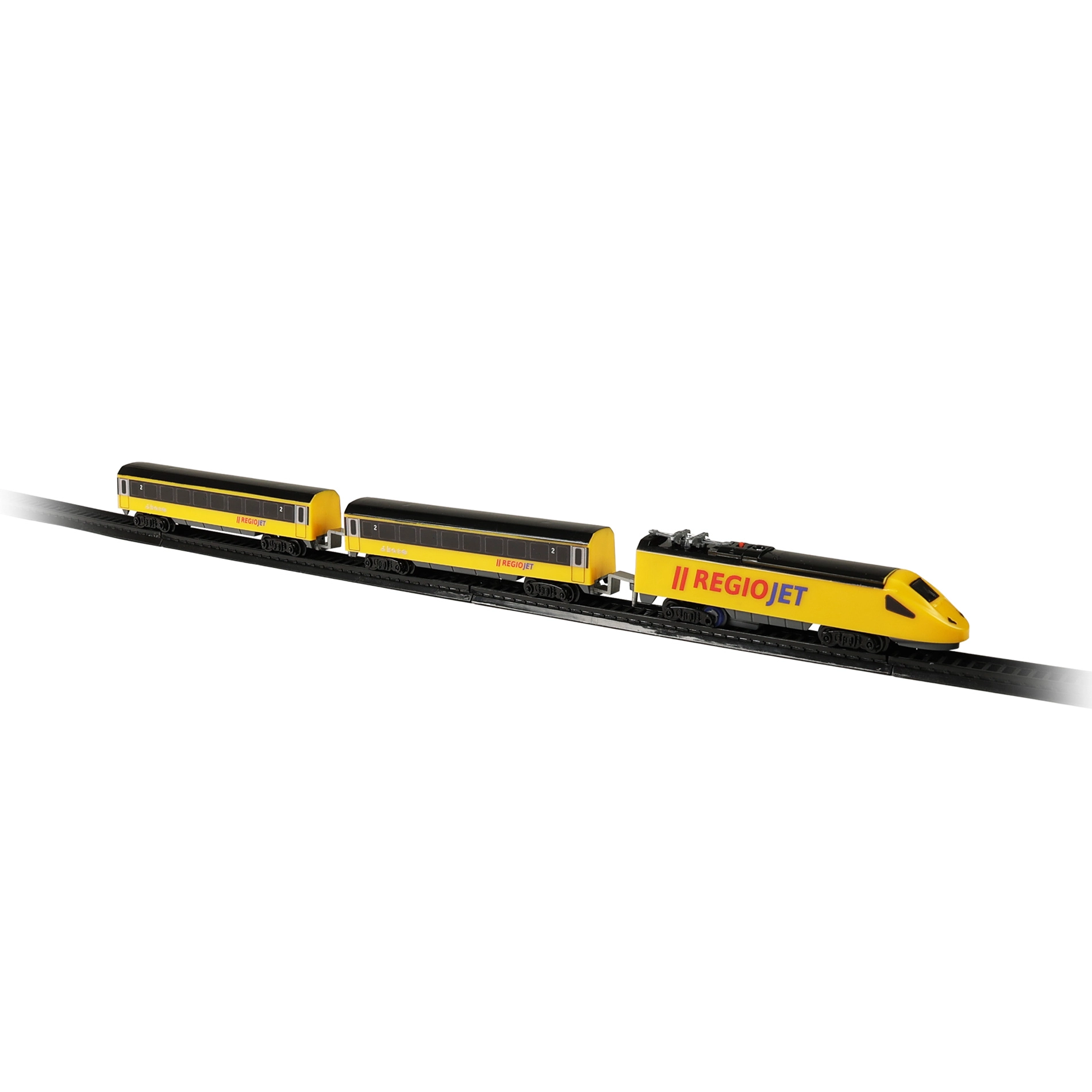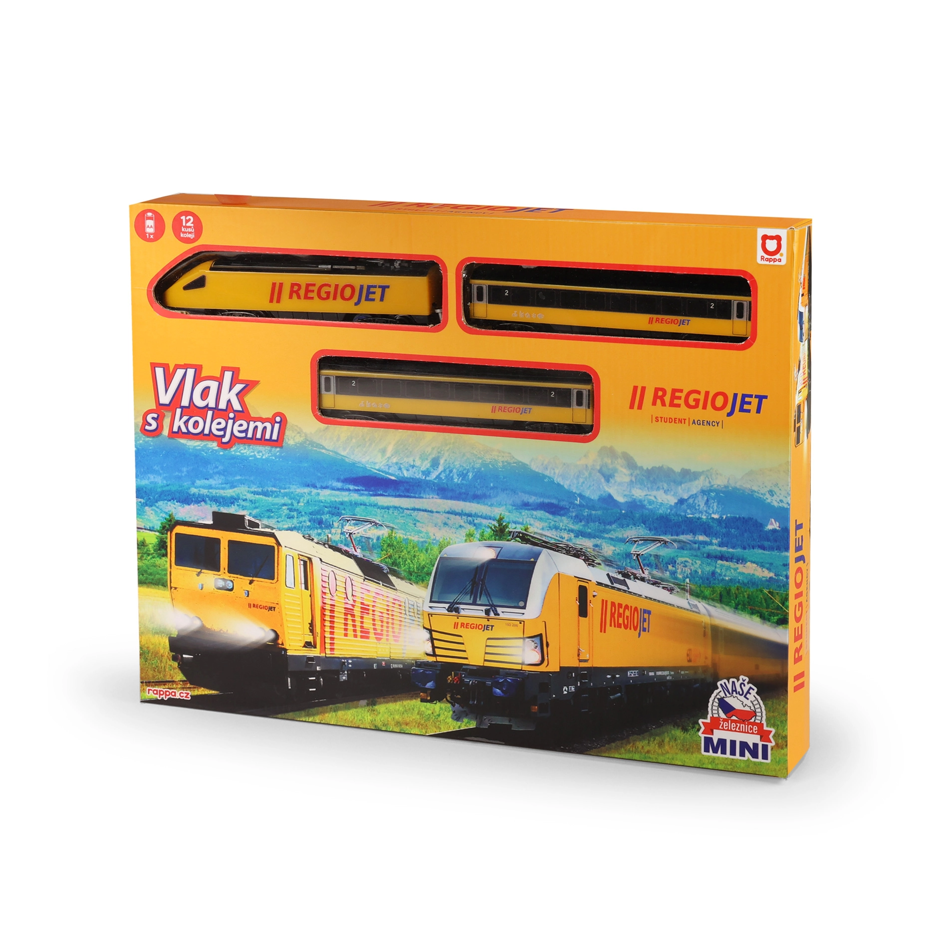 Odkryj radość z kolejki dzięki kompaktowemu zestawowi RegioJet MINI. Żółta lokomotywa z dwoma wagonami jeździ po modułowym torowisku, które łatwo złożysz z 8 zakrzywionych i 4 prostych elementów. Dzięki praktycznemu przełącznikowi na dachu lokomotywy sterowanie jest bardzo proste, więc dzieci mogą szybko zacząć zabawę.