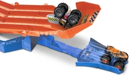 Rozpętaj wielkie pojedynki potężnych trucków z zestawem Hot Wheels Monster Trucks Wyścig Demolki. Ustaw pojazdy na szczycie, podnieś bramkę startową i obserwuj, jak stromy zjazd wyłania zwycięzcę. Losowa zwrotnica przepuści tylko jednego – drugi zaliczy efektowny crash.