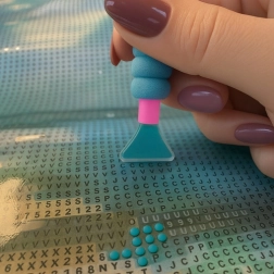 Rowkowana tacka, aplikator i wosk zapewniają precyzyjne nabieranie i umieszczanie kryształków we właściwych miejscach zgodnie z symbolami na płótnie.