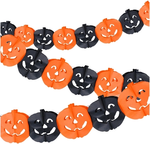 Papierowa girlanda z dużymi dyniami w intensywnym pomarańczowym kolorze doda każdej imprezie odpowiedniego halloweenowego klimatu. Ma długość 3 m, a wymiary jednej dyni to 17,5 × 17,5 cm – wyrazista dekoracja na Halloween, jesienne przyjęcia, do domu, przedszkola, sklepu czy ogrodu. Lekka konstrukcja i łatwe zawieszenie zapewnią błyskawiczną dekorację z efektem „WOW”.