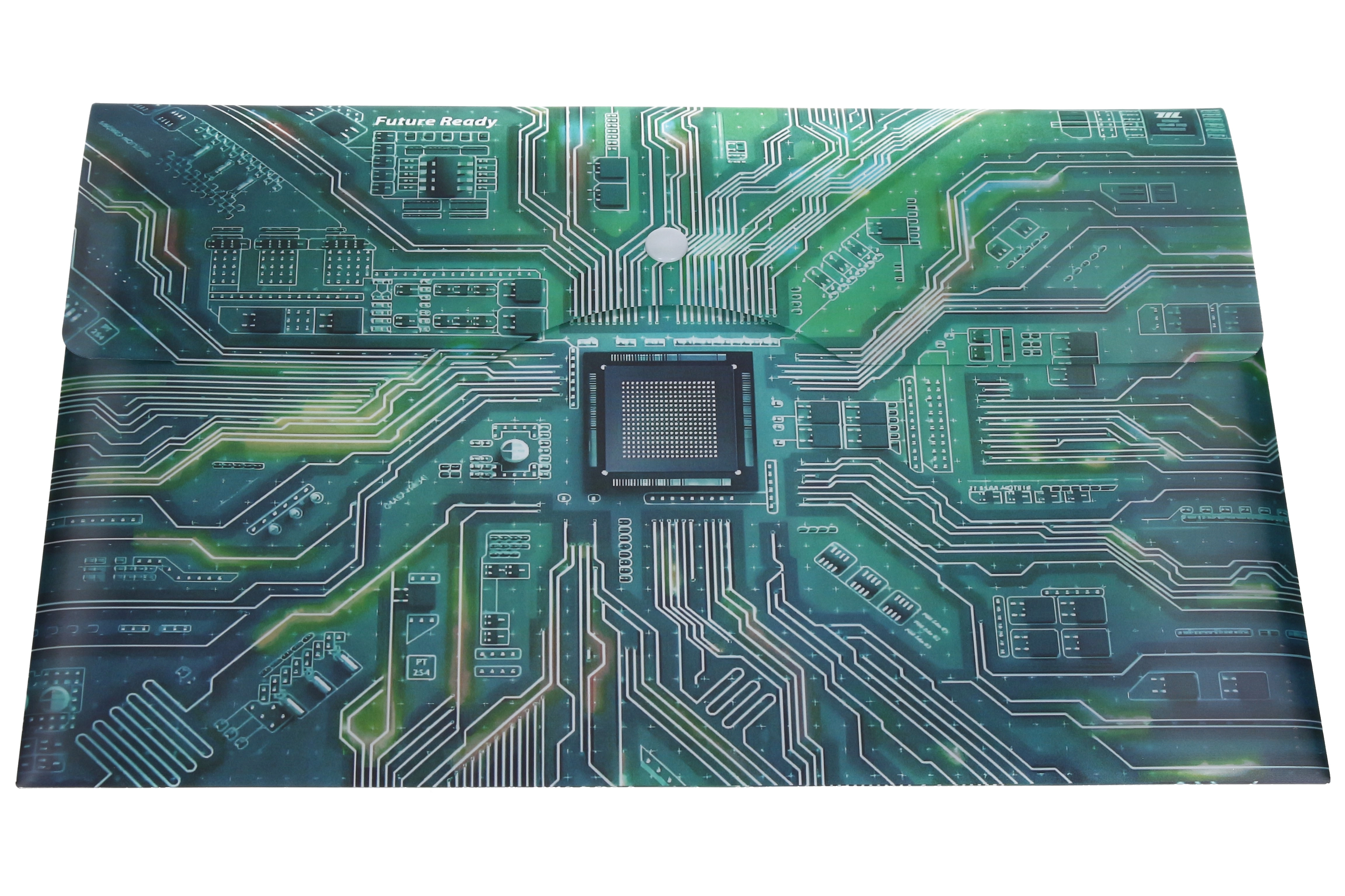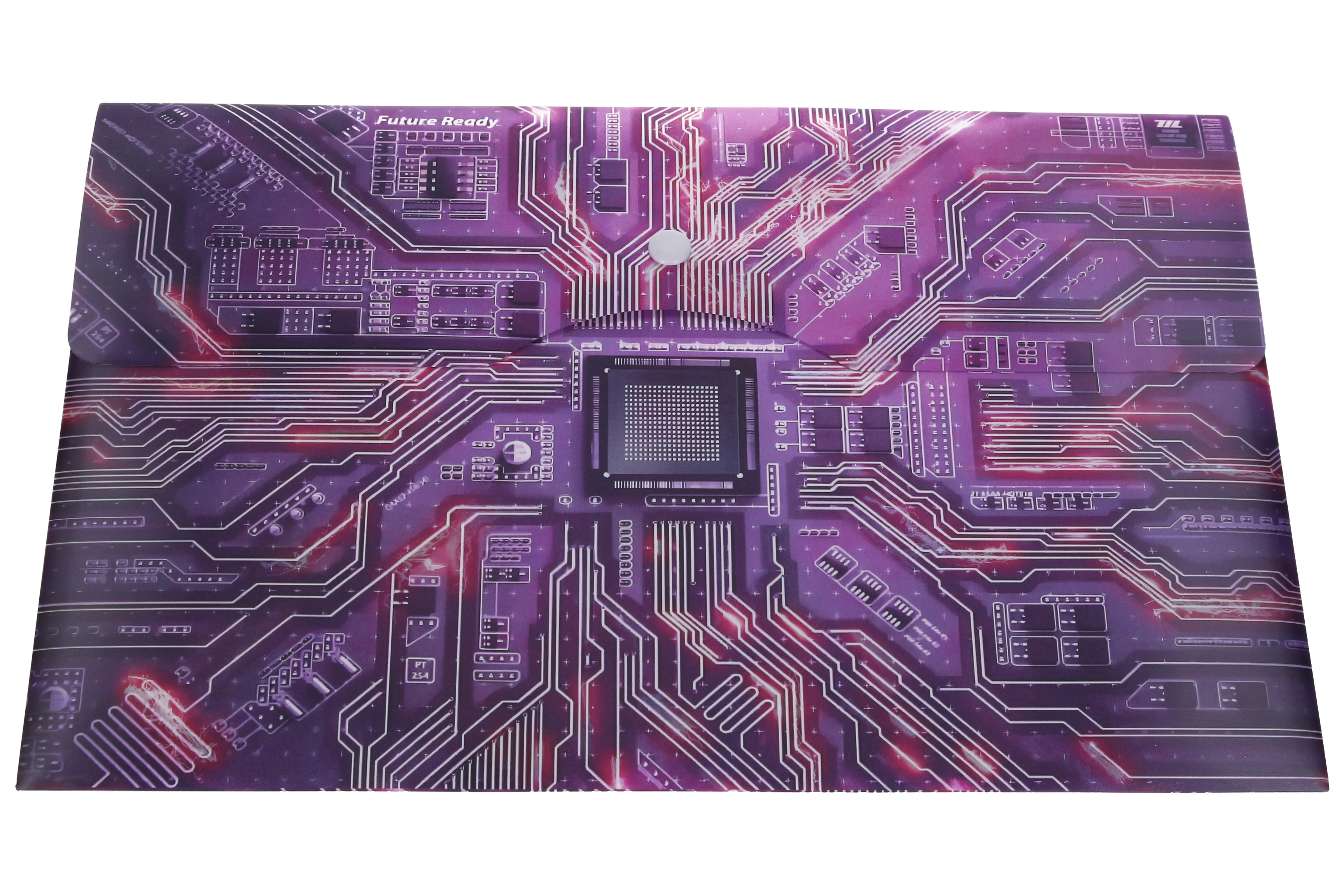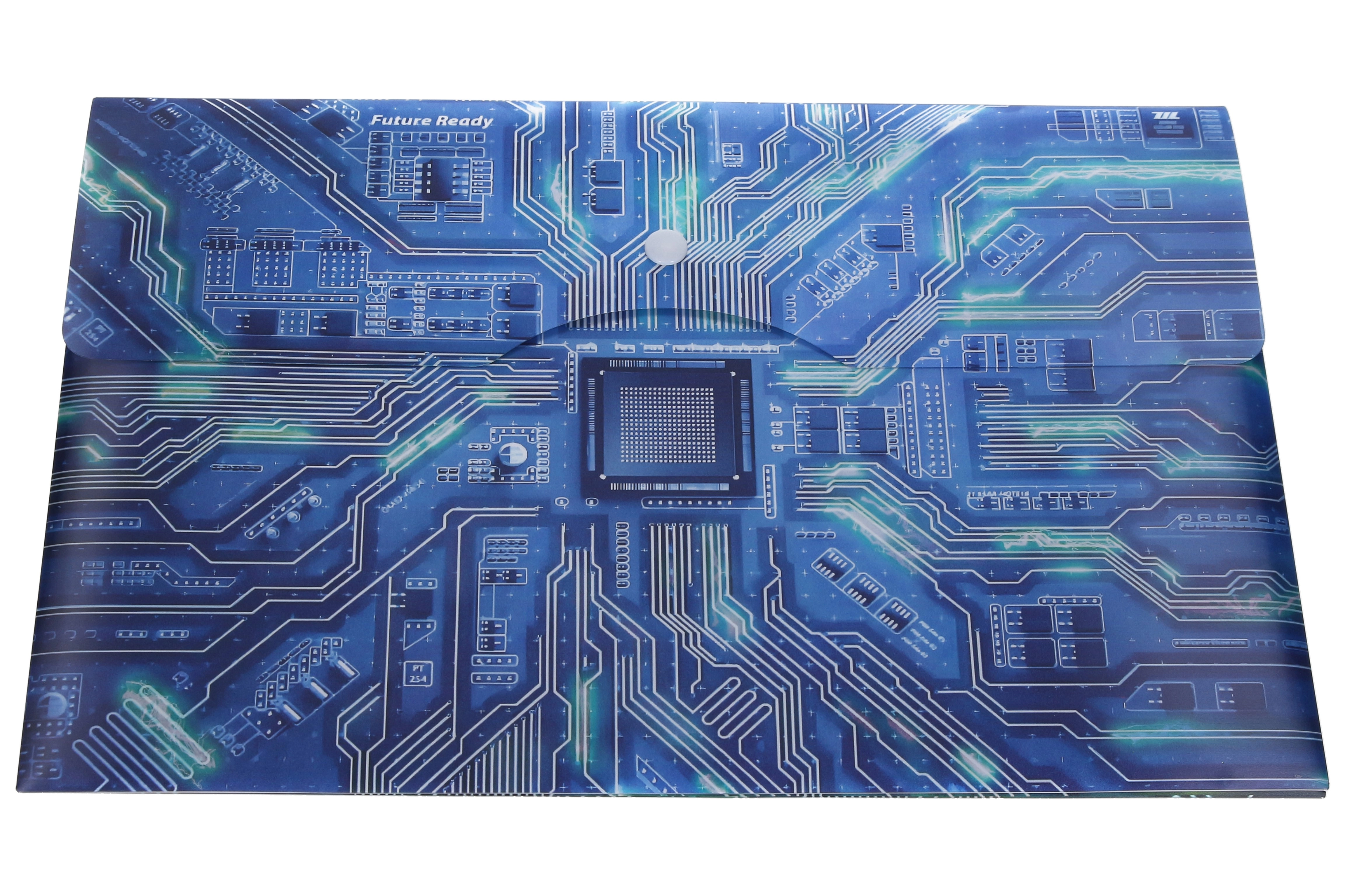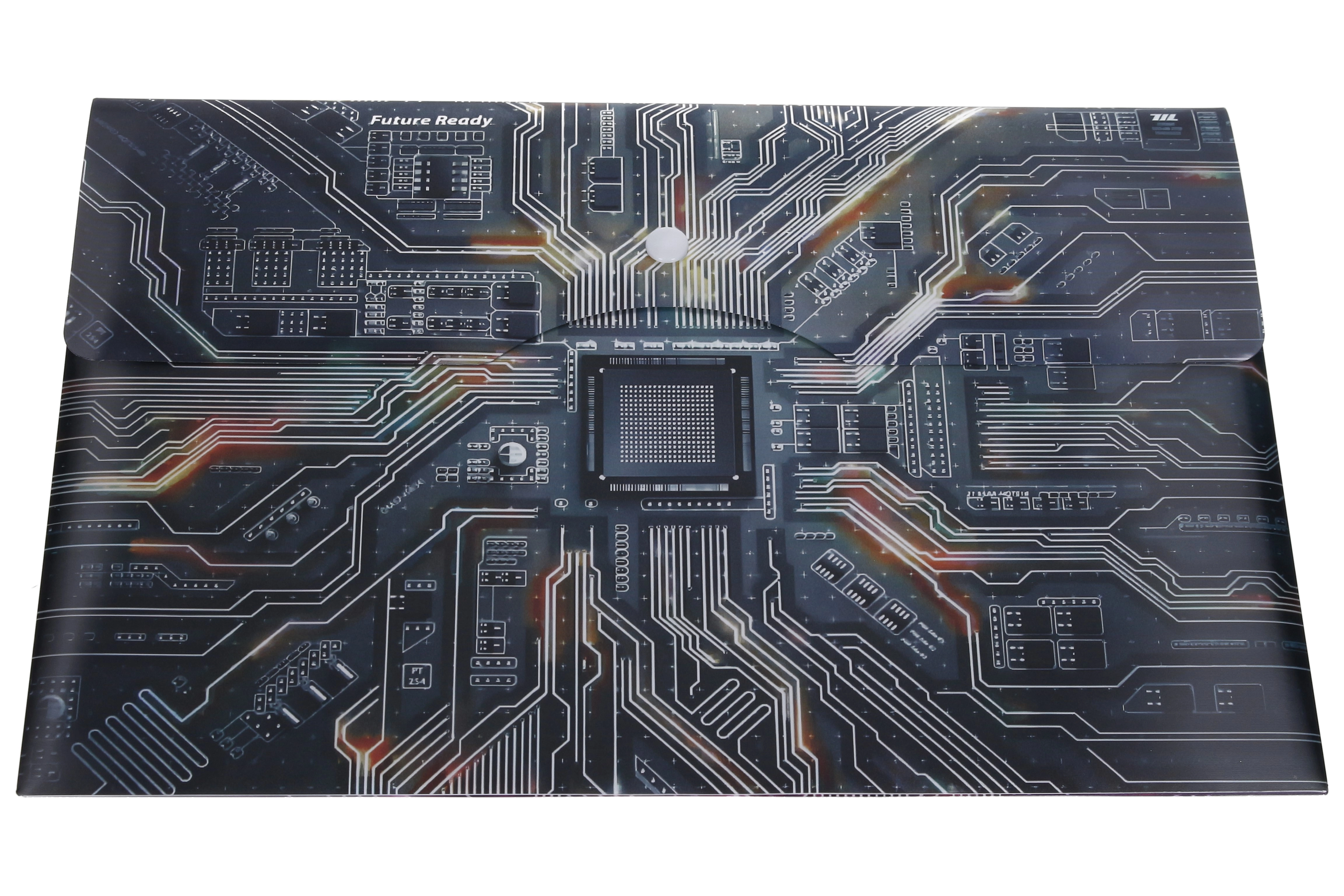 Utrzymuj swoje dokumenty w porządku i bezpiecznie przechowane. Ta wytrzymała plastikowa teczka z motywem płyty głównej i napisem „Future Ready” oferuje perfekcyjne połączenie funkcjonalności i nowoczesnego designu. Format A4+ bez problemu pomieści standardowe kartki oraz nieco większe materiały, a niezawodne zapięcie na zatrzask zapobiega przypadkowemu wysuwaniu dokumentów.