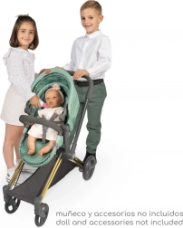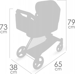 Praktyczne rozwiązania uzupełnia regulowana budka, trzypunktowy pas dla bezpiecznego posadzenia lalki oraz pojemny dolny kosz. Wózek szybko się składa do przechowywania i przewożenia w samochodzie. W zestawie elegancka odpinana torba w kolorach kolekcji.