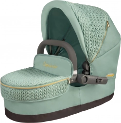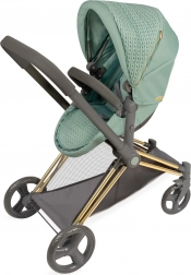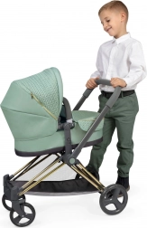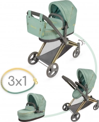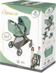 Elegancki dziecięcy wózek dla lalek 3 w 1 z kolekcji CAPRICCIO w nowoczesnym, miętowozielonym kolorze oferuje głęboką gondolę, wersję spacerową oraz przenośną wanienkę. Ma regulowaną budkę, obrotowe przednie kółka dla łatwego manewrowania, kosz na akcesoria i odpinaną torbę ze złotymi zamkami. Dzięki składanej konstrukcji nie zajmuje dużo miejsca i jest idealny dla dzieci od 3 lat.