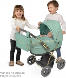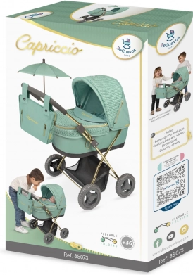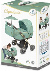 Stylowy wózek dla lalek z kolekcji Capriccio 2025 zachwyca nowoczesnym designem w kolorze miętowej zieleni, niską wagą i łatwą obsługą. Oferuje składaną konstrukcję, parasolkę, odpinaną torbę ze złotymi zamkami, miękki materacyk oraz praktyczny kosz na akcesoria – idealny dla młodszych dzieci od 3 lat.