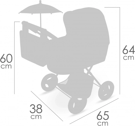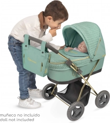 Wózek jest świetnie wyposażony do codziennej zabawy – od składanej parasolki, przez odpinaną torbę ze złotymi zamkami, po miękki materacyk i przestronny kosz na drobiazgi. Precyzyjne wykonanie i hiszpański design podkreślają jego jakość i trwałość.