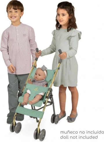 Stylowy i praktyczny składany wózek dla lalek z kolekcji CAPRICCIO w nowoczesnym miętowozielonym kolorze oferuje łatwą obsługę, stabilną metalową konstrukcję oraz trzypunktowy pas dla bezpiecznego mocowania lalki. Dzięki kompaktowym wymiarom idealnie sprawdzi się w podróży i w domu.