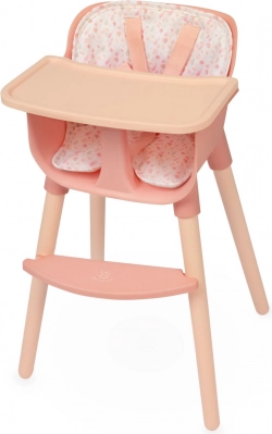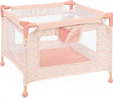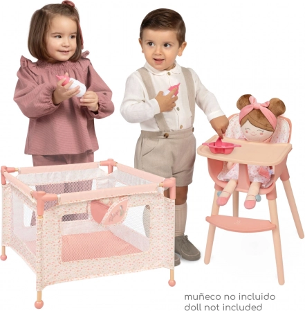 W zestawie znajduje się solidny kojec do zabawy z siateczkowymi ściankami i praktyczną kieszenią na drobiazgi oraz krzesełko do karmienia z odpinanym stolikiem i trzypunktowym pasem dla bezpiecznego posadzenia lalki. Oba produkty przeznaczone są dla lalek do 36 cm i wyróżniają się łatwą obsługą oraz pielęgnacją.
