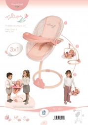 Stylowe dziecięce krzesełko i huśtawka 3 w 1 z kolekcji Tulipe zachwyca delikatnym designem i sprytną funkcjonalnością. Dzięki zdejmowanemu, dwustronnemu siedzisku można je używać jako krzesełko do karmienia, huśtawkę oraz nosidełko. Nie brakuje pasów bezpieczeństwa, plastikowego tacko-stolika do karmienia oraz lekkiej, a jednocześnie stabilnej konstrukcji zapewniającej łatwą obsługę. Idealne dla lalek do 50 cm i dzieci od 3 lat.