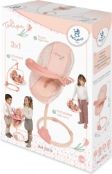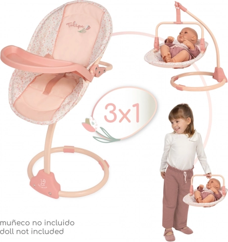 Wielofunkcyjne krzesełko i huśtawka dla lalek 3 w 1 z kolekcji Tulipe wyróżnia się subtelnymi pastelowymi tonami i kwiatowym wzorem, dzięki czemu pięknie wkomponuje się w dziewczęcy pokój. Nowoczesna konstrukcja pozwala szybko zmieniać tryby zabawy i wspiera wyobraźnię oraz opiekę nad lalką.