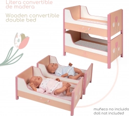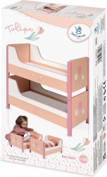Eleganckie drewniane łóżeczko dla lalek 2 w 1 z kolekcji Tulipe zachwyca delikatnymi pastelowymi odcieniami i kwiatowym motywem. Dzięki sprytnemu rozwiązaniu łatwo zamienisz je z łóżka piętrowego na dwa oddzielne łóżeczka. W zestawie są 2 materace, wysokiej jakości wykonanie i łatwa obsługa – idealny dodatek do pokoiku dla lalek do 48 cm.
