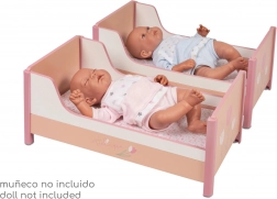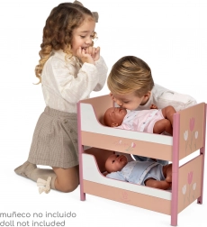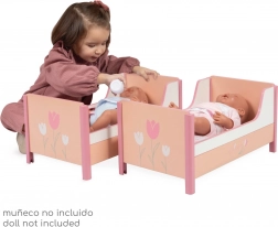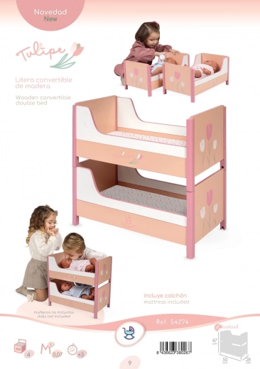 Podaruj dzieciom piękną scenerię dla ich ulubionych lalek. Drewniane łóżeczko 2 w 1 z kolekcji Tulipe w ciepłych łososiowych tonach ze stylowym kwiatowym wzorem oferuje zarówno spanie piętrowe, jak i rozłożenie na dwa oddzielne łóżka. Precyzyjny hiszpański design i solidna konstrukcja z płyty MDF oraz litego drewna gwarantują długą żywotność i bezpieczną zabawę.