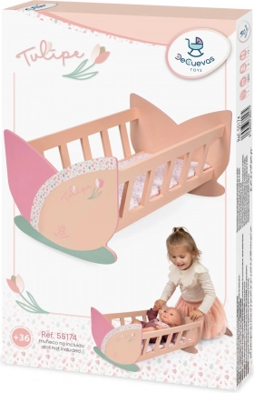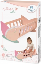 Oba szczyty kołyski mają kształt tulipana, które w połączeniu z ciepłymi łososiowymi pastelami tworzą subtelny, nowoczesny wygląd. Kołyska jest stabilna, wytrzymała i dzięki jakościowym materiałom łatwa w utrzymaniu. Doskonały wybór do codziennej zabawy i jako element dekoracyjny pokoju.