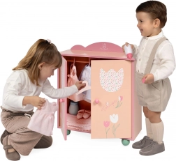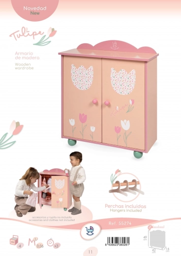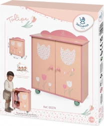 Stylowa drewniana szafa na ubranka dla lalek z kolekcji TULIPE zachwyca delikatnym pastelowym designem, precyzyjnym wykonaniem oraz praktycznym układem wnętrza. W zestawie znajduje się drążek na ubrania oraz 3 drewniane wieszaki do przejrzystego przechowywania ubranek. Świetny dodatek do pokoju dziewczynki, idealny dla dzieci od 3 lat.